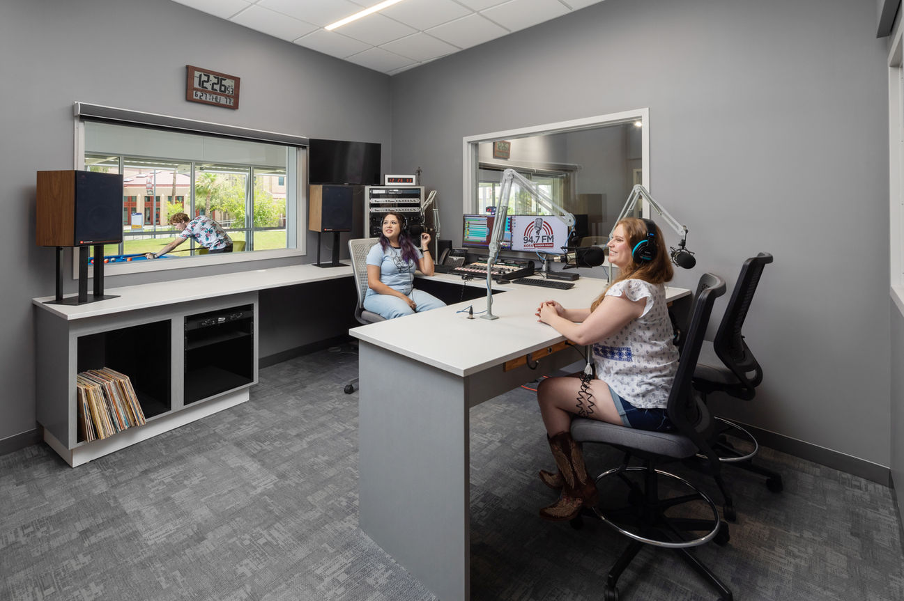 The Multimedia Center’s teaching and learning environment consist of a new AM/FM radio station and television studio with an emphasis on technology. Students and the public can observe “behind the scenes” production through glass walls and TV monitors. The RGB-lighted eSports arena invites the public to watch a collegiate-level gaming match on TV monitors installed throughout the space.